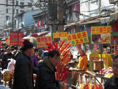 Ich war bei zahlreichen Essen mit der Familie dabei, es war sehr nett. Hier in Zentral-/Zentralsüdchina isst man schärfer als bei mir im Jangtse-Delta, das gefällt mir. Es gibt z.B. leckeren „scharfen Rettich“, den man überall dazu essen kann, Fisch aus dem Dongting-See usw., es gab Baijiu (das 50-60%-Teufelszeug, das ich aber auch gern hab) … Am Abend haben wir Jüngeren herumgeböllert, die Älteren haben Karten gespielt … Da es hier keine echten Heizungen gibt, ist es üblich, die Füße auf einen niedrigen Tisch mit Holzgitter zu legen, unter dem eine kleine elektrische Heizung ist, und eine Decke über die Beine zu legen. Außer beim Schlafen hab ich fast immer meine Jacke angehabt.