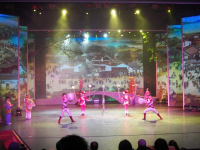 http://v.youku.com/v_show/id_XOTEwMDc2NzY=.html Dann sahen wir z.B. eine Wohnsiedlung in Hangzhou, wo eine kleine Shaoxing-Oper (auch: Yue-Oper; das ist ein Stil der chinesischen Oper, andere sind etwa die Beijing-Oper oder die Sichuan-Oper) vorgespielt wurde – ja, tatsächlich! Ein Beziehungsstreit, allerdings nur etwa 10 Minuten lang und sowohl die Musik als auch der Gesang waren Playback. Und ich habe gehört, dass es diese Oper nur einmal im Jahr dort in der Siedlung gibt, und nur für die Ausländer. So etwas soll es dort in der Nähe auch im ehemaligen Haus eines reichen Händlers aus dem 19. Jahrhundert geben, allerdings auch eher show-mäßig und nicht „echt“ wie vor 100 Jahren. Wie auch immer, in dieser Wohnsiedlung war es sehr nett, es waren viele Chinesen da – darunter viele ältere Leute, aber nicht nur –, wir konnten scharfen Fisch und Pfannkuchen probieren, haben eine eingewickelte chinesische Medizin gegen Mücken bekommen, uns mit den Leuten unterhalten ….. Am Abend gab es dann noch eine Einladung zur „Impressions of the Westlake“-Show, die u.a. von Zhang Yimou konzipiert wurde und bei der eine Hangzhouer Liebesgeschichte nachgespielt wird. Dabei sitzt man draußen und das Ganze spielt auf einem abgegrenzten Teil des Westsees, hier gibt es Bilder: