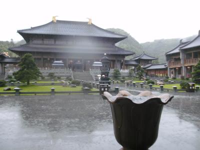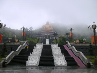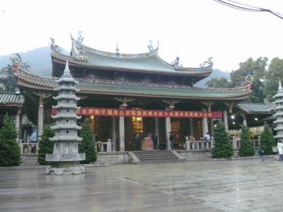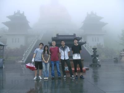 Eine dieser Studentinnen besuchte ich auch vor kurzem in ihrer Heimatstadt Fenghua (mit dem Bus etwas mehr als 2 Stunden, allerdings braucht man von meinem Campus zur Busstation in Hangzhou auch nochmal 2 Stunden mit dem Bus oder 1 Stunde mit dem Taxi), die zum Verwaltungsgebiet von Ningbo (auch Provinz Zhejiang) gehört. Hier haben wir uns erst einmal einen Tempel angeschaut. Ich bin inzwischen etwas gelangweilt von Tempeln, muss aber sagen, dass dieser besonders schön war, da es gerade regnete, es somit frische Farben gab und er auf einem Berg mit Wolkenfetzen war; außerdem gab es eine große goldene, wenn auch moderne (also nicht historische) Buddha-Statue. Seht selbst: