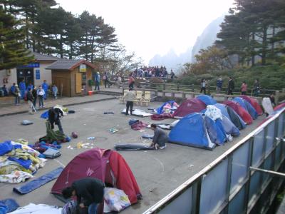 Wir waren nicht die einzigen Dummen, die ohne Bettenreservierung nach oben gegangen sind. Wir sind aber in Stockbetten auf einem Hotelgang untergekommen. Es wurden noch viele zusätzliche Betten im Hotel aufgestellt, auch in der Lobby, und vom Hotel gestellte Zelte vor den Hotels. Am Wochenende ist eben mehr los …